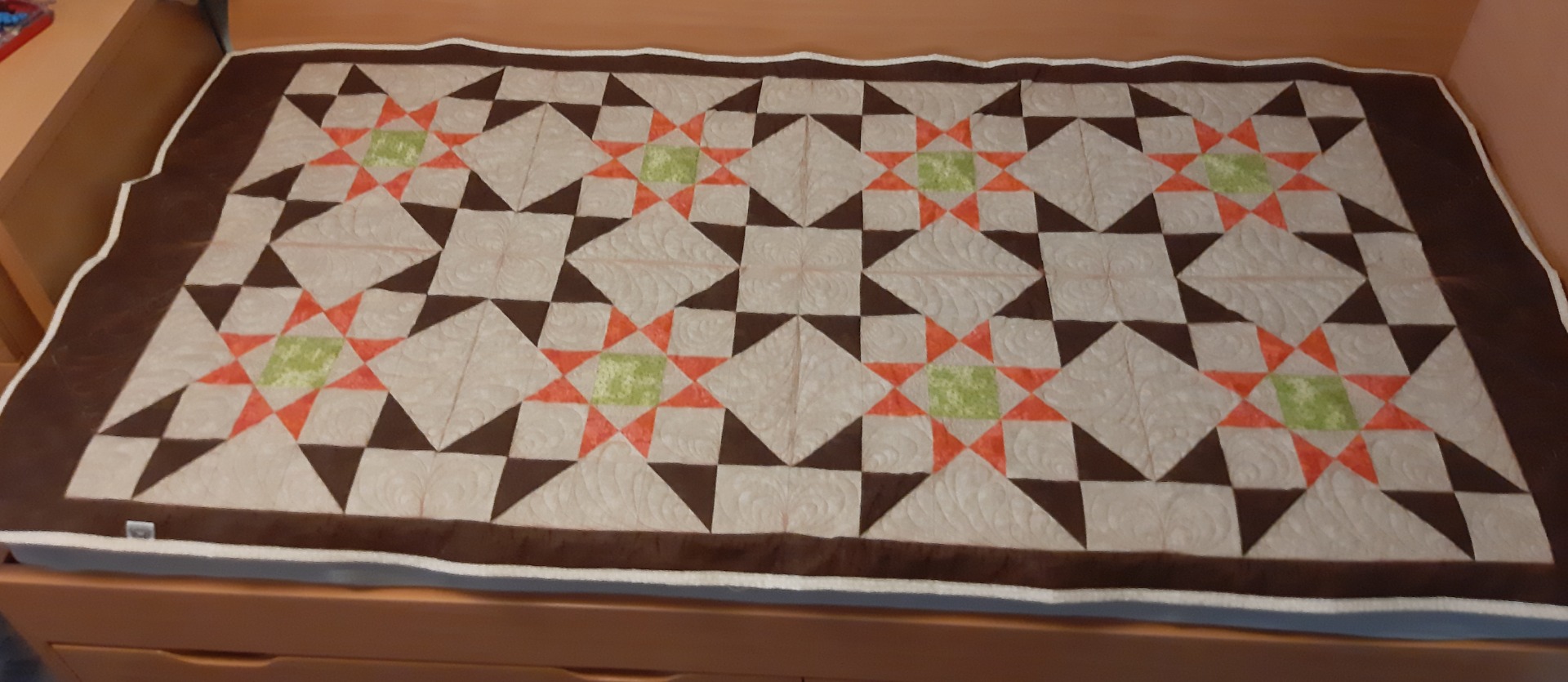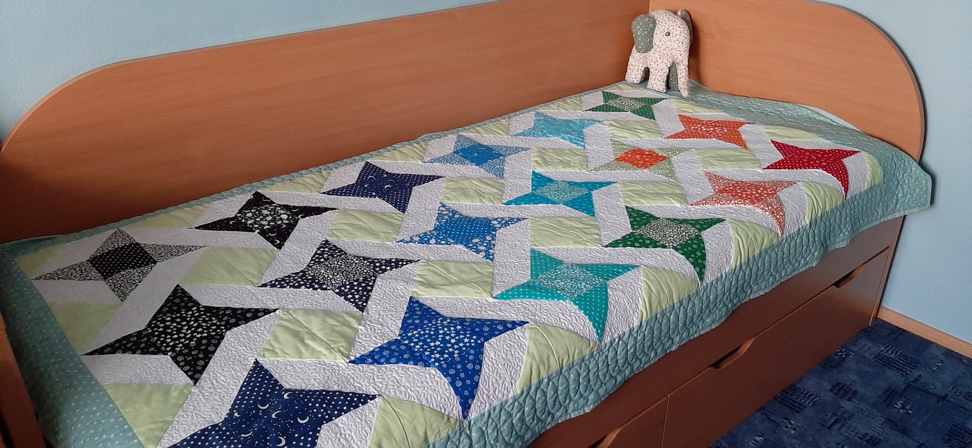 Dílek za dílkem sešijeme do většího celku, tzv. bloku. Z několika bloků pak sešíváme horní vrstvu deky, tzv. top. Top podložíme výztuhou, zpravidla vatelínem, a spodní látkou. Tyto tři vrstvy spojíme prošitím, tzv. quiltováním. Buď prošíváme ve švu nebo kousek od švu a nebo prošíváme volně. Při volném prošívání/quiltování vytváříme ozdobné vzory a bordury, čímž přidáváme na kráse a hodnotě quiltu (deky).